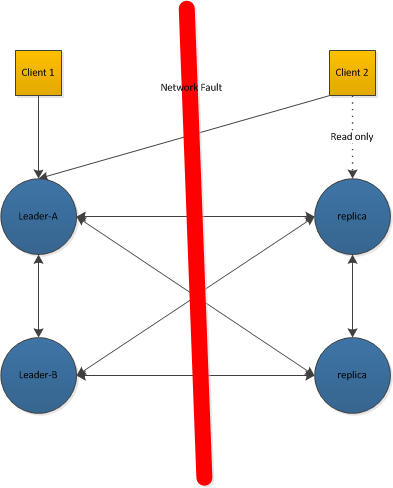 leaders不在一个partition,此时CAP-consistent丢失,如果按照CAP理论,只能称之为AP