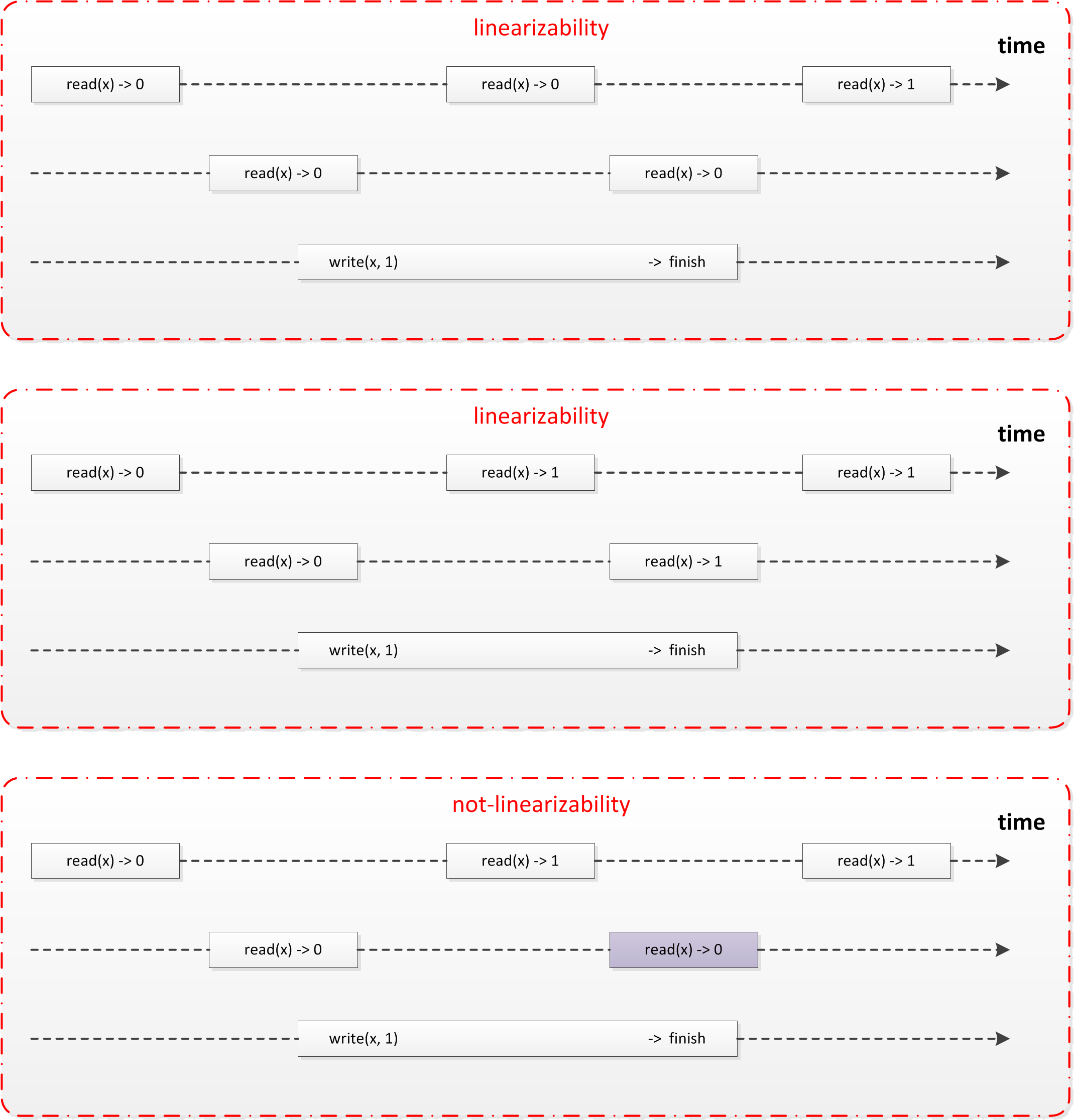 所谓的linearizability其目的在于描述系统的数据,对外看起来就像只有一份,所有针对这部分数据的操作都是原子(Concurrency-atomic)的;在分布式系统领域来讲和CAP-consistent是等价的;在多核并发编程时由于存在CPU-Cache一致性问题,linearizability的概念同样适用。